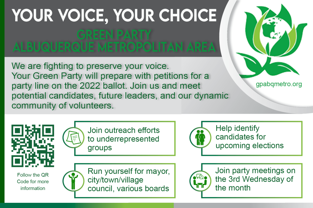 UPDATE! (29 July 2021) GPNM has started petitioning to reclaim the Green Party ballot line. Please contact us if you can help collect signatures at outdoor markets, fairs, festivals, or other events. You can download the petition and a script/guide at the GPNM web site and begin collecting signatures from anyone registered to vote in New Mexico.