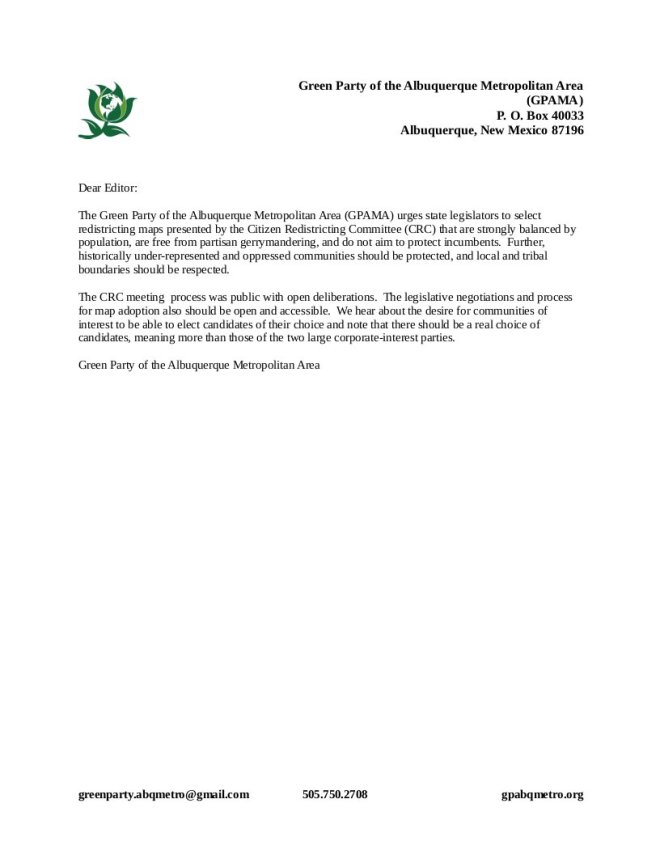 Post-census redistricting has begun. There is a somewhat hierarchical list of requirements for good redistricting: population balance (one person, one vote), protection and representation of under-represented and oppressed groups, district contiguity and compactness, party and incumbent neutrality, and representation for communities of interest. A former, long-time state representative once said that politics is about the division or distribution of resources. Basically, who gets what and how much. It is important for the breadth of diversity of a state, county, or city to be represented in the decision makers. With these concepts in mind, a coalition of groups (including GPAMA and GPNM), led by Fair Districts New Mexico, supports the adoption of redistricting maps from the sets of maps adopted by the Citizen Redistricting Committee. We strongly encourage you to write letters to the editor of your local newspapers, print and electronic, and to contact your legislators directly to encourage adoption of one of the CRC maps for Congress, State Senate, State House, and Public Education Commission.
