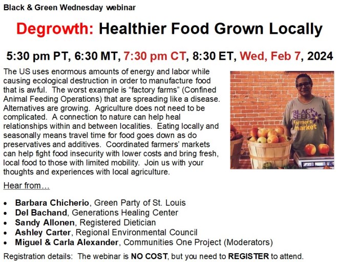 “Degrowth: Healthier Food Grown Locally” Wednesday, February 7, 6:30 p. m. MST. Register on Zoom: https://bit.ly/491lzqQ or Facebook: https://fb.me/e/6va4m2Xr5 Share this:TweetMoreShare on TumblrPocket Click to email a link to a friend (Opens in new window) Email Click to print (Opens in new window) Print Like Loading... Published by gpabqmetro The Green Party of the Albuquerque Metropolitan Area represents Sandoval, Bernalillo, Torrance, and Valencia Counties in New Mexico, U. S. A. View all posts by gpabqmetro
