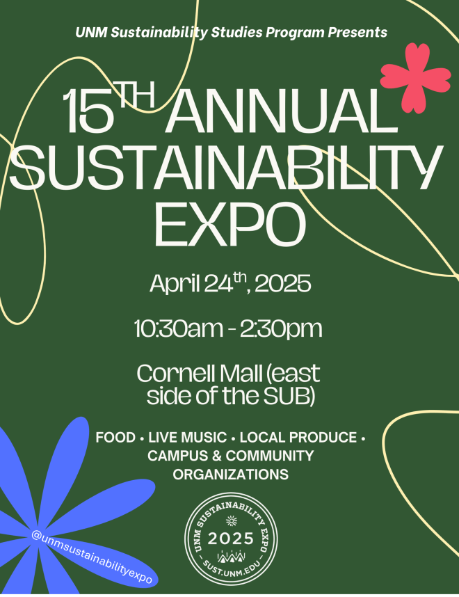 UNM Sustainability Expo is Thursday, April 24, from 10:30 a. m. to 2:30 p. m. on the Cornell Mall at the UNM Main Campus. Visit our booth and many others at this cool event from the Sustainability Studies Program.