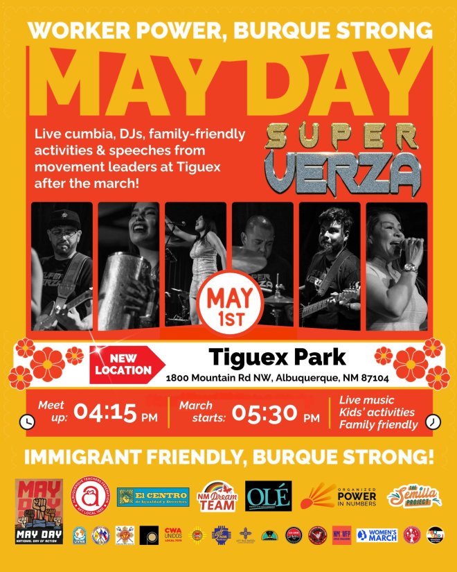 Join the worker celebration and community solidarity event at Tiguex Park, 1800 Mountain Rd. NE. Gathering begins at 4:15pm. March is at 5:30pm. Speechifying is after the march. This is a family event with live music, food trucks, and activities for the kids.