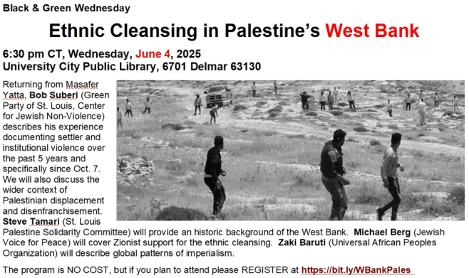 Green veteran returns to U. S. A. after a few months in the West Bank. Hear about what he saw and learned by pariticipating in the webinar on Wednesday, June 4, 2025, 5:30 pm MDT on Zoom. Register in advance at https://us06web.zoom.us/meeting/register/zaURk6w4TXe_J6ET1ezeGw#/registration