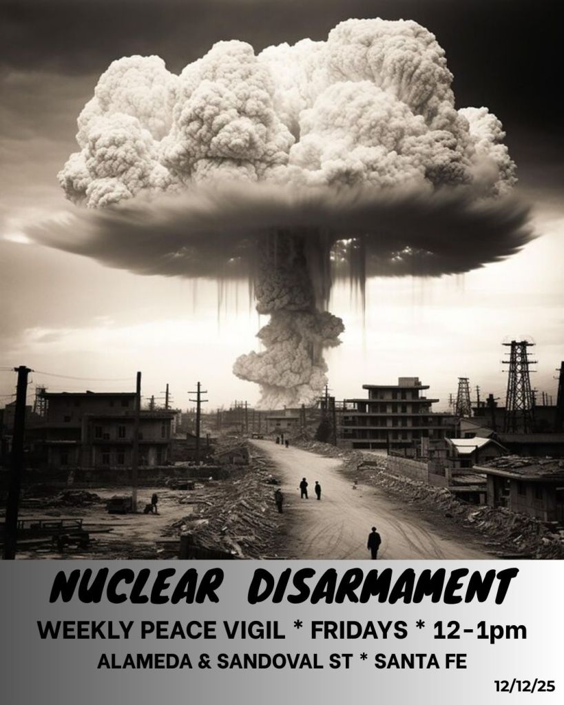 The Friday peace and anti-nukes vigil continues. Saturday, December 13, join the Raging Grannies for a sing-along on the Plaza at 2:00 p. m. Song titles include “It’s Beginning to Look a Lot Like Fascism”, “Auld Lang Syne For Freedom”, “Walking In a Nuclear Wasteland”, “Green Trees (Greensleeves)”, “ and I’m Dreaming of a Kind Christmas”.