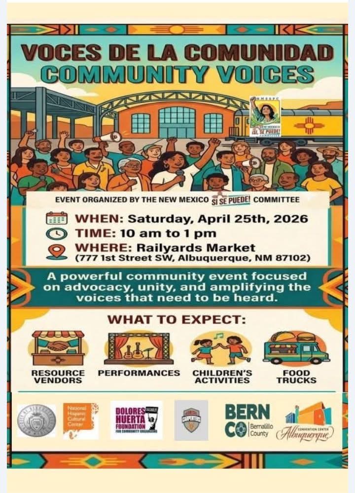 Saturday, April 25, 10am-1pm, Voces de la Comunidad (Community Voices), Railyards Market in ABQ.